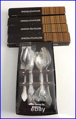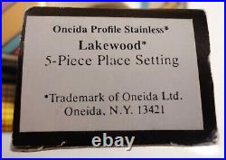 For sale are the new old stock Oneida Profile stainless Lakewood 5 piece place settings and 4 piece hostess set shown in the listing photos. PLEASE NOTE that the hostess set consists of 2 unwrapped serving spoons and a wrapped butter knife and sugar spoon. Please read the detailed Condition description section.
