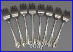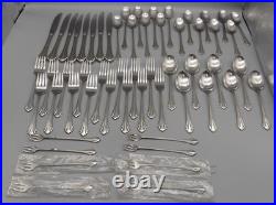 This is a wonderful vintage 59-piece set of Oneida Distinction Deluxe Stainless Flatware in the Rembrandt pattern. This is a complete service for 8 including: 8 knives, 8 salad forks, 8 dinner forks, 8 teaspoons, 8 soup spoons & 8 iced tea spoons & 8 seafood forks (4 still sealed). I'm also including 3 serving pieces - server, meat fork and ladle. These are all marked on the back: Distinction Deluxe Stainless by Oneida.