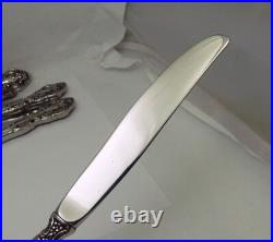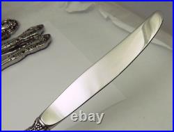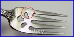 One salad fork has an area with some more noticeable scuffs - see close-up marked in red, and the knives have some scuffs and pinpoint black specks on the blades seen under close examination. You will get 12 each place spoons, salad forks, dinner forks, and dinner knives; 18 teaspoons; 1 each gravy ladle, sugar spoon, meat fork; 2 slotted serving spoons.
