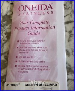 Flatware Set in the Golden Juilliard pattern by Oneida. BRAND NEW FROM MY PERSONAL SET NEVER USED. The MPN # is 2231048E / Product information guide is not included, only pictured to show flatware name and MPN. This is a complete service for four. Four Dinner Knives, each measuring 9-1/2 in length.