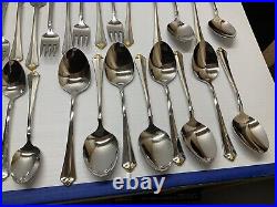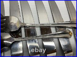 Each piece, from the tea spoons to the serving forks, is designed with a traditional style and a geometric handle pattern that ensures a comfortable grip. Made in the United States, the set is a blend of durability and classic beauty, making it a lasting addition to your dining essentials.