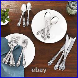 WHO IT'S FOR: Those seeking stainless steel silverware that has a timeless appeal and historical grandeur, making every meal into a special occasion. WHAT'S IN THE BOX: Includes a 45-piece flatware set for 8 people, plus a 5-piece serving set. Each of the 8 flatware place settings includes a dinner fork, salad fork, dinner, dinner spoon, and teaspoon. Serving set includes a serving spoon, pierced serving spoon, sugar spoon, butter, and serving fork.