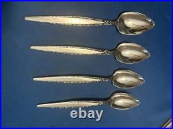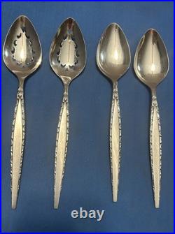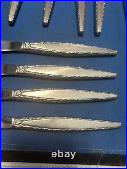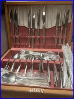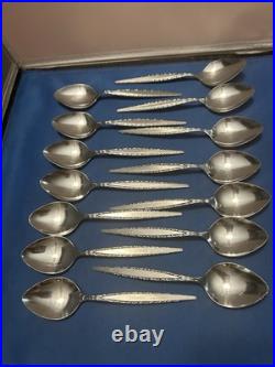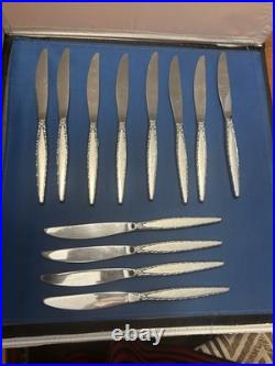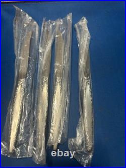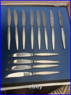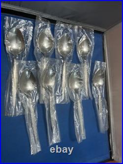 Add a touch of elegance to your dining table with this classic and timeless flatware set. 2 large slotted serving spoons. 4 new wrapped steak knives. 8 new wrapped soup spoons.