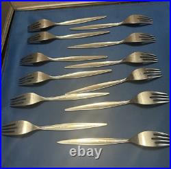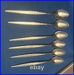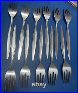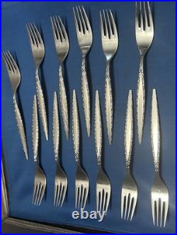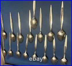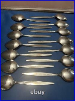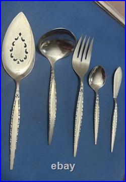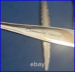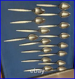 This Vintage Oneida Community Stainless Steel Venetia Pattern Flatware Set includes 112 pieces of silver-colored knives, forks, spoons, serving pieces, and more. Made of stainless steel with a brushed and glossy finish, this set features abstract and brushed handle patterns in a mid-century modern style. Manufactured in the United States, this reusable and dishwasher-safe set is perfect for holiday celebrations and all occasions.
