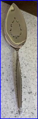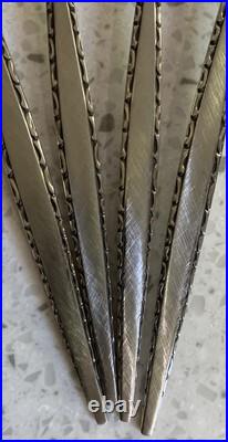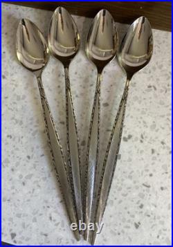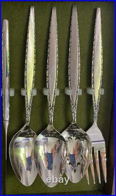 Beautiful Vintage Oneida Community Stainless Venetia Pattern Flatware and case in excellent condition. This set may have been used once or twice but looks to be in unused condition. Complete 6 piece service for 8 with service pieces, Iced Tea spoons and pie server. Brushed handles with edge swirls. Storage box shows light storage scratches exterior lu with Green internal felt lining. An excellent example of Mid Century design. As always your satisfaction is guaranteed.